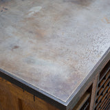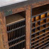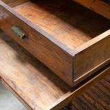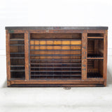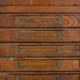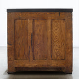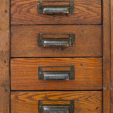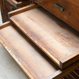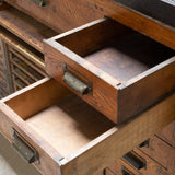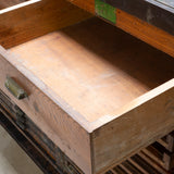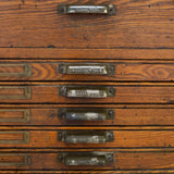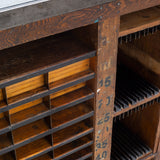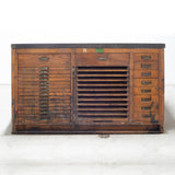 An early 20th century printmaker's typeset workbench. The work surface is solid iron and sits on top of the base. The nicely worn wooden base has 2 large drawers, 8 small drawers, 15 flat drawers with brass cardholders, and 11 pull out trays with bronze glide rails inside. All the drawers have original Hamilton steel drawer pulls. The other side has two original Hamilton tags, one large cubby and multiple cubbies with numbered, steel dividers. The piece is structurally sound and has retained the naturally distressed look of an industrial piece of this kind.