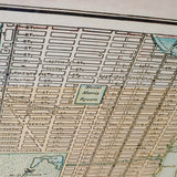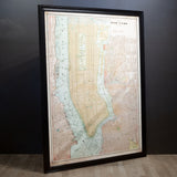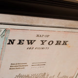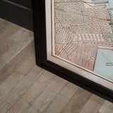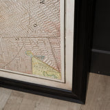 Timothy Oulton historic city map print of New York and it's surrounding boroughs in belvelled Solid Oak black wood frame. Timothy Oulton's vintage map print reflects historic New York City and its surrounding boroughs.