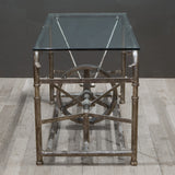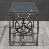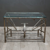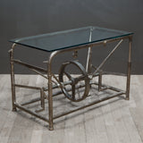 An original adjustable surgeon's operating table with a large center steel wheel that raises and lowers the whole piece. A new piece of 1/2" thick tempered glass has been added to the top. This piece has retained its original finish and has the appropriate patina for the age and use.